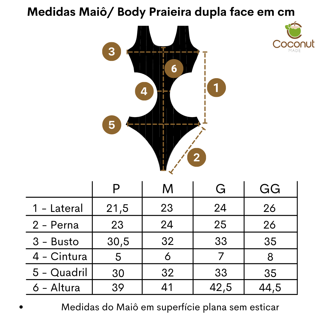 Podendo ser utilizado tanto como Maiô ou como Body, o modelo Praieira é ainda dupla face e pode ser utilizado de 6 formas diferentes, variando o look conforme o seu desejo.